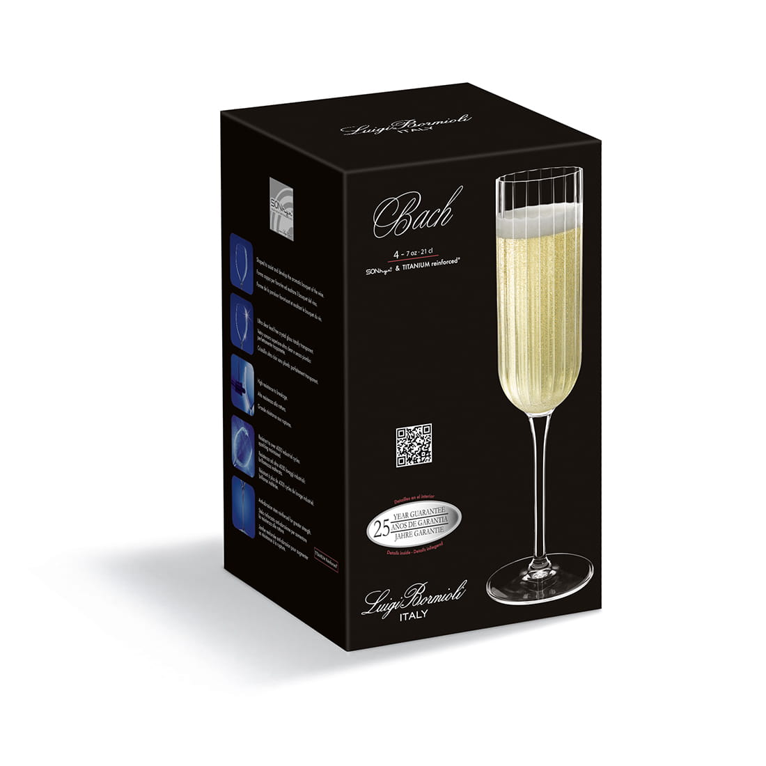 BACH to również technologia TITANIUM Reinforced, czyli kolejne udoskonalenie produkcyjne Luigi Bormioli dążące do wzmocnienia i utwardzenia trzonu kieliszka, znacznie zwiększające odporność trzonu na otarcia, zarysowania. Jest to pierwsza tego typu technologia wzmacniająca trzony kieliszków, zwiększająca ich odporność na złamania o 140%.