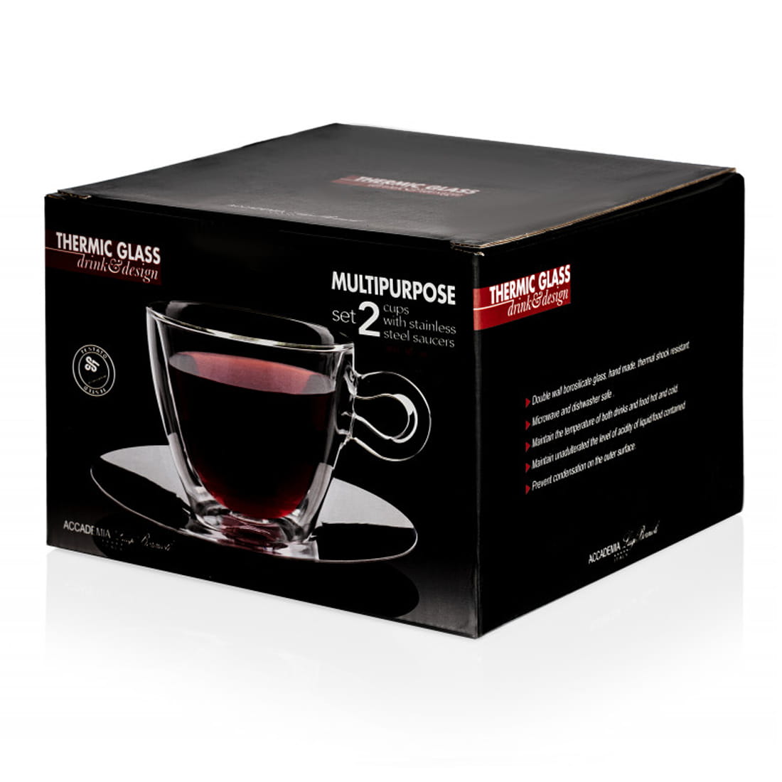 Filiżanka do herbaty THERMIC GLASS to bardzo stylowy, unikalny sposób na prezentację gorących napojów. Wykonany został z wysoce odpornego szkła, szczególnie na szoki termiczne oraz zapewniającego doskonałą izolację termiczną podawanych napojów - gorących i zimnych. Nadaje się do mikrofali i zmywarek. Specjalnie produkowane szkło zapobiega kondensacji pary wodnej na zewnętrznej powierzchni szklanki, więc prezentacja napoju nie zostanie zaburzona. W rezultacie temperatura gorących napojów utrzymuje się dłużej niż w przypadku innych materiałów takich jak na przykład porcelana. W końcu linia THERMIC GLASS to nie tylko świetny, unikalny wygląd, ale i zgodne z przeznaczeniem, odpowiednio dobrane właściwości szkła. Spodki wykonane są ze stali nierdzewnej.