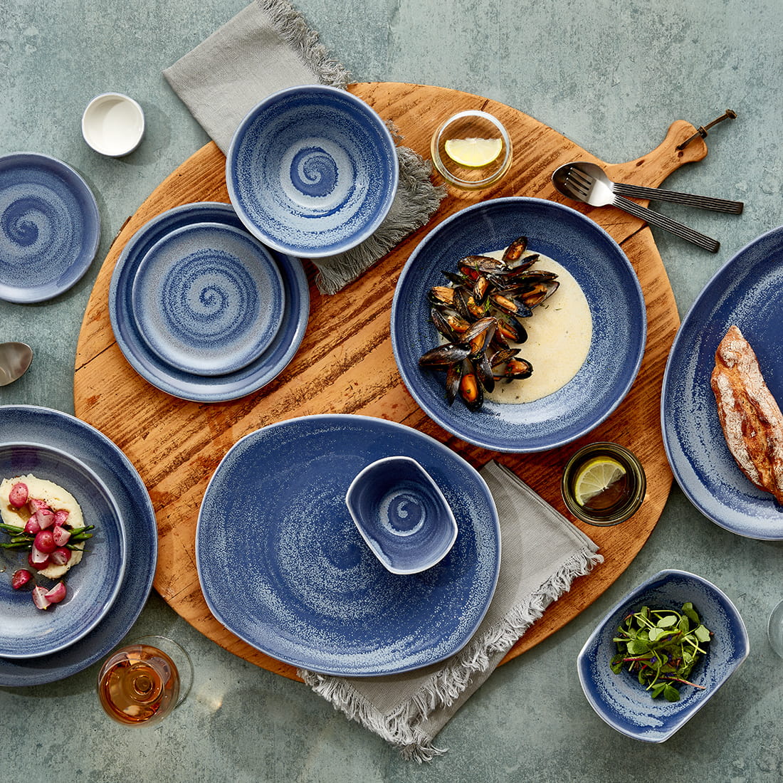 Naczynia Revolution nie tylko zachwycają estetyką, ale również są funkcjonalne. Dwukolorowa kompozycja, z niebieskim dominującym z góry, a białym od spodu, tworzy harmonijne zestawienie, które z łatwością wpisuje się w różnorodne aranżacje stołu. Seria jest także kompatybilna z linią Aurora Revolution, co daje możliwość jeszcze szerszej i kreatywniejszej prezentacji dań. Linia Revolution to nie tylko naczynia, to sztuka, która podkreśla wyjątkowość każdej potrawy.