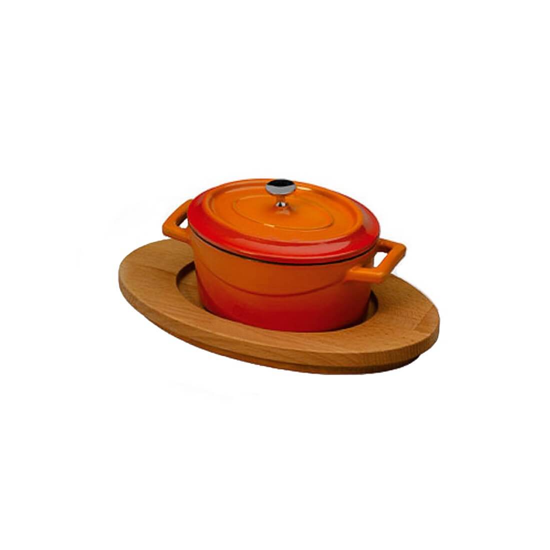 Owalna podstawa drewniana o wymiarach 12 x 9 cm. Pasuje do naczynia żeliwnego owalnego SOP12612/O i SOP12612/A z pokrywką o pojemności 0,4 l w kolorze pomarańczowym. Wyprodukowane przez włoską firmę Agnelli, która już od ponad wieku nieustannie doskonali swoją ofertę produkując niezawodne i wysokiej jakości garnki, patelnie i akcesoria używane z powodzeniem na całym świecie.