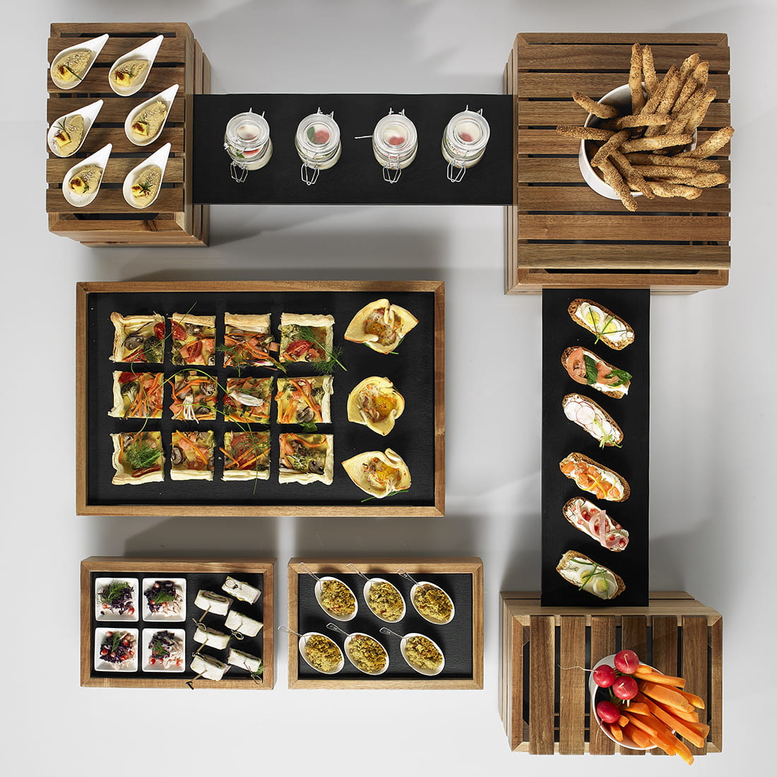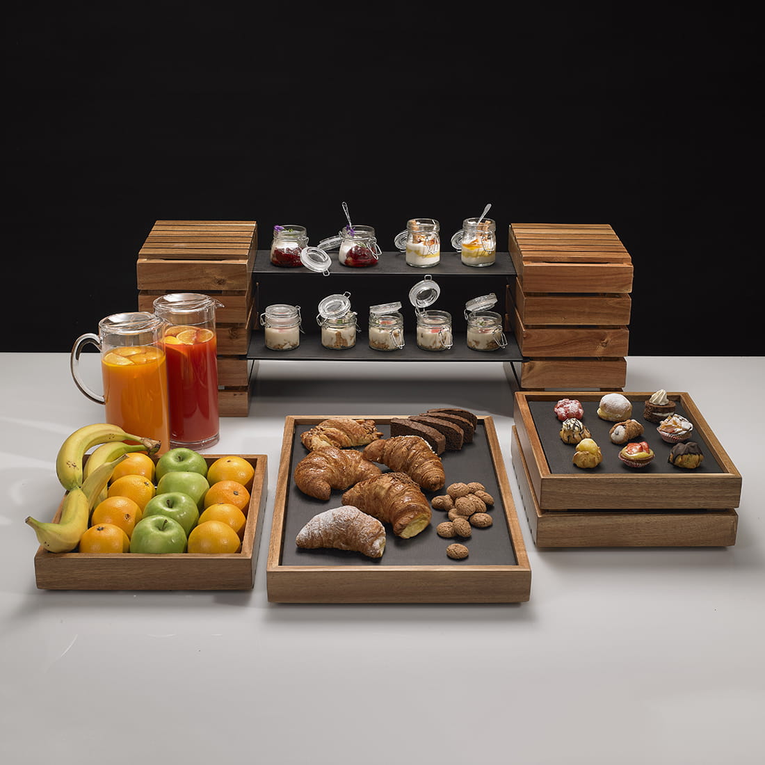 Skrzynka z drewna akacjowego może służyć jako pojemnik do ekspozycji owoców, pieczywa lub innych przekąsek niewymagających naczyń. Dzięki naturalnemu wyglądowi drewna akacjowego, skrzynka doskonale wpisuje się w wiele różnych stylów aranżacyjnych, od klasycznego po nowoczesny. Skrzyneczka może służyć jako samodzielny element ekspozycyjny lub być częścią dużego zestawu bufetowego, który można dowolnie rozbudowywać o poszczególne elementy według potrzeb.