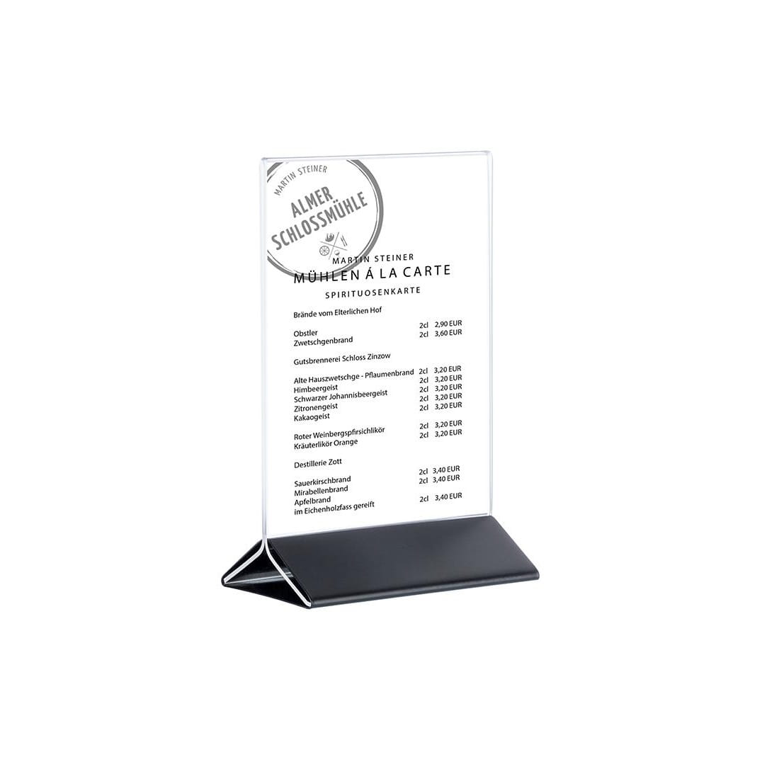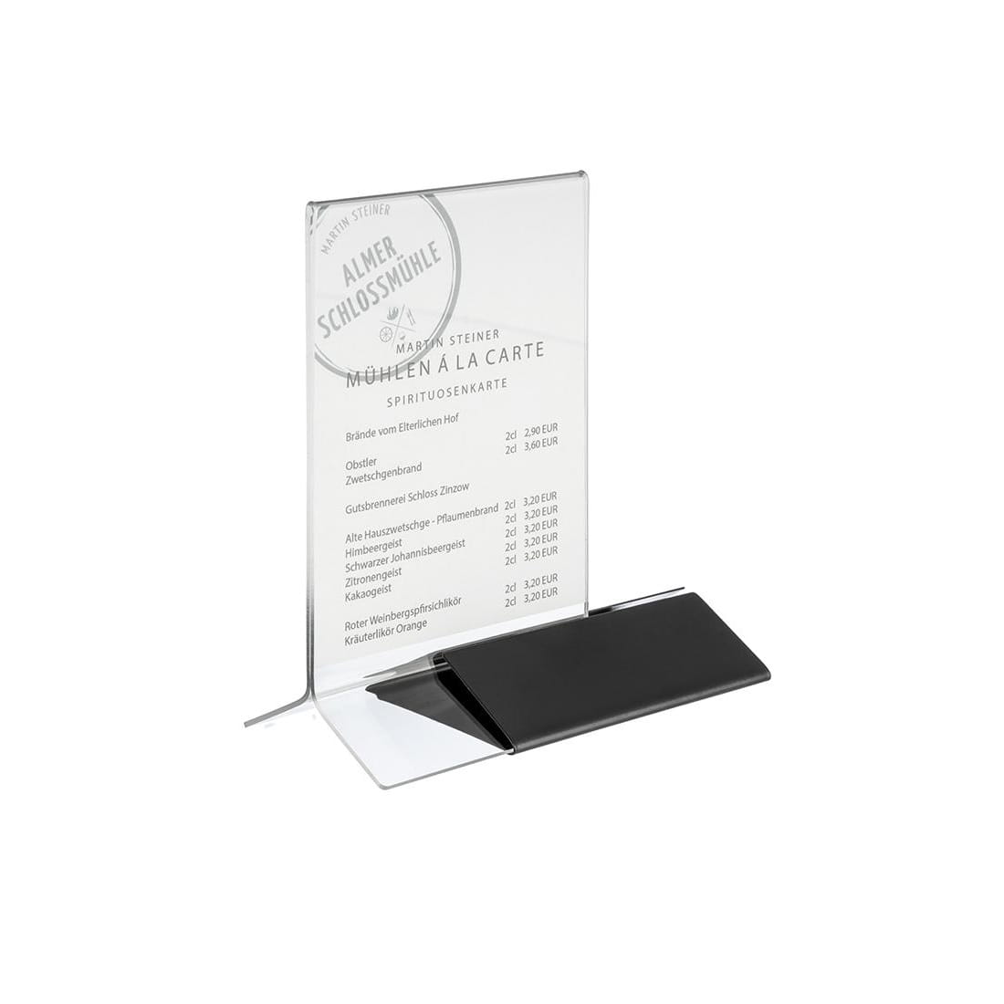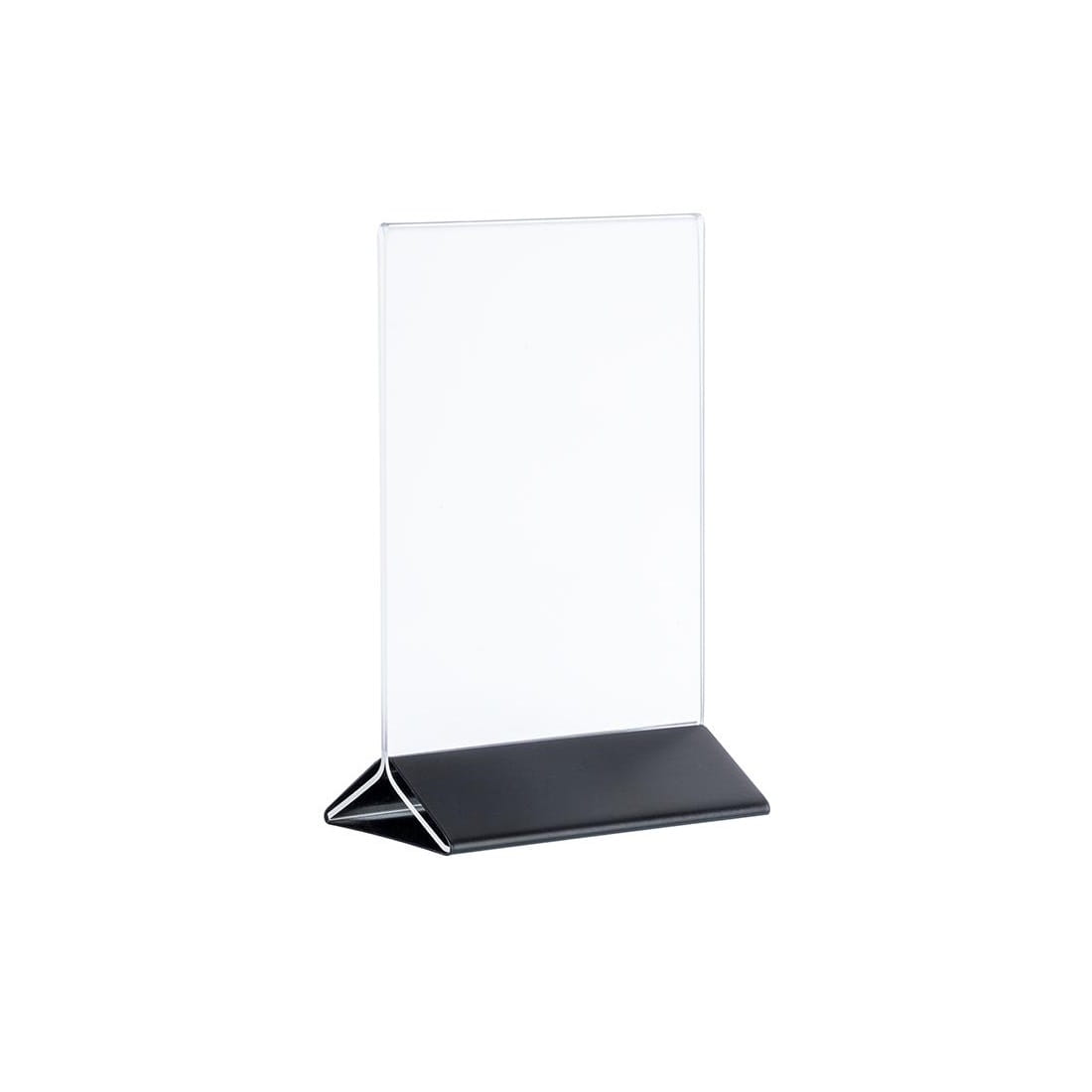 Ten elegancki dwustronny stojak na menu wyróżnia się przezroczystym wykończeniem i solidną konstrukcją. Jest idealnym rozwiązaniem do menu o formacie A4 lub innych istotnych informacji w restauracjach, hotelach lub na różnego rodzaju przyjęciach. Wykonany z trwałej stali nierdzewnej oraz akrylu. Dzięki swojemu eleganckiemu wyglądowi i solidnej konstrukcji, stojak ten dodaje profesjonalizmu i stylu do każdego stołu. Umożliwia szybką i łatwą wymianę menu w razie potrzeby. Podstawa w czerni.