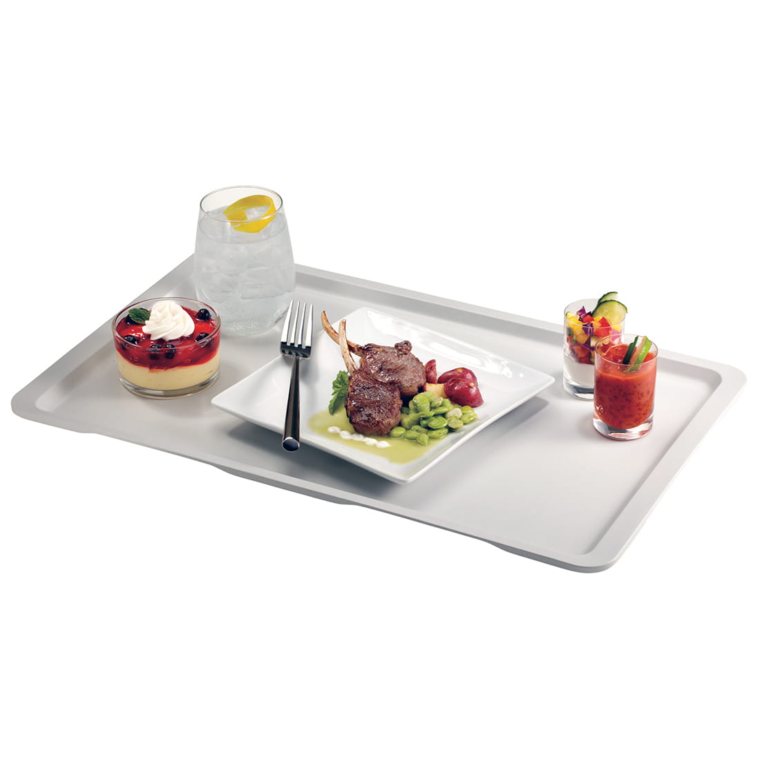 Taca wykonana z SMC, poliester wzmocniony włóknem szklanym. Dzięki tej technologii taca jest odporna na zadrapania, zaplamienia i wypaczanie. Wytłoczenia na zewnętrznej stronie tacy pozwalają w przypadku składania mokrych tac w stosy na swobodną cyrkulację powietrza pod i nad tacą w celu szybszego osuszania i zabezpieczają stabilność sterty tac przy przenoszeniu lub składowaniu. Szeroki rant i wysokie krawędzie zapewniają bezpieczne przenoszenie posiłków. Tace nadają się do wielokrotnego mycia i wyparzania w zmywarkach gastronomicznych przy użyciu środków myjąco-dezynfekujących nowej generacji. Odporne na temperatury w zakresie od -400C do +1400C. Wymiary tacy 325 x 530 mm (GN 1/1) powodują, że można ich używać w standardowych wózkach odkładczych, nie są jednak rekomendowane do stosowania w wózkach podgrzewanych. Tace świetnie się sprawdzają w stołówkach i barach samoobsługowych a także w obiektach zbiorowego żywienia.