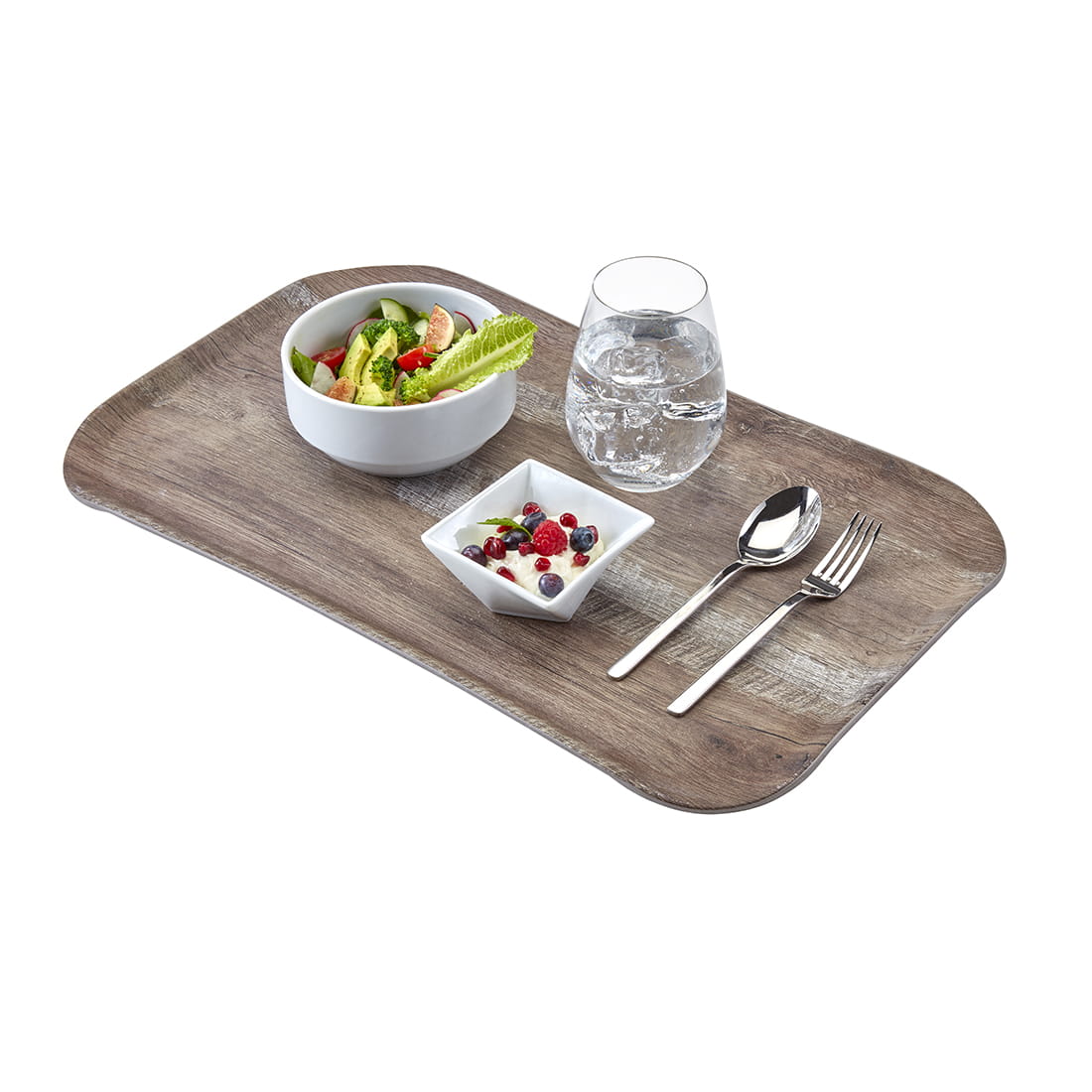 Taca poliestrowa WOODEN GRAIN w pięknym kolorze ciemnego dębu od Cambro idealnie sprawdzi się w restauracji, hotelu, barze, szpitalu czy kawiarni. Niezwykle odporna na zniszczenia chemiczne i mechaniczne.